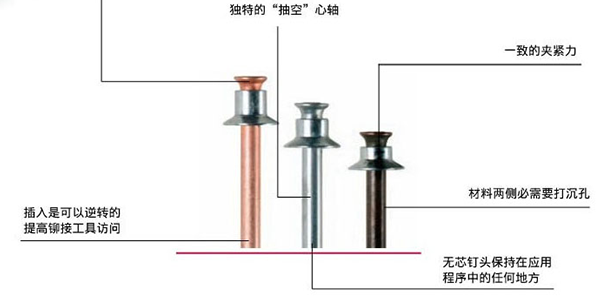 平头拉钉紧固件与传统螺栓利用扭力旋转产生紧固力不同,平头拉钉紧固件利用虎克定律原理,经由拉铆钉专用铆钉枪,在单向拉力的作用下,拉伸栓杆并推挤套环,将内部光滑的套环挤压到螺杆凹槽使套环和螺栓形成100%的结合,产生永久性紧固力。